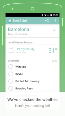 PackPoint is a travel packing list organizer and packing planner for serious travel pros. PackPoint will help you organize what you need to pack in your luggage and suitcase based on length of travel, weather at your destination, and any activities planned during your trip.